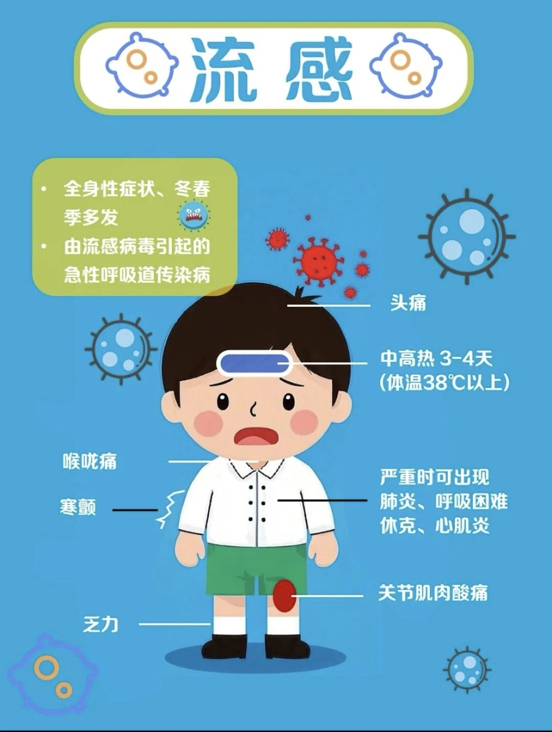 ◆流行性感冒(流感):由流感病毒引起(当前流行的主要是甲型H3N2)起病急,常见高热(39–40℃)、畏寒、全身酸痛、乏力,呼吸道症状相对较轻。传染性强,可能引发肺炎等严重并发症,对老人、儿童、慢性病患者等威胁大。