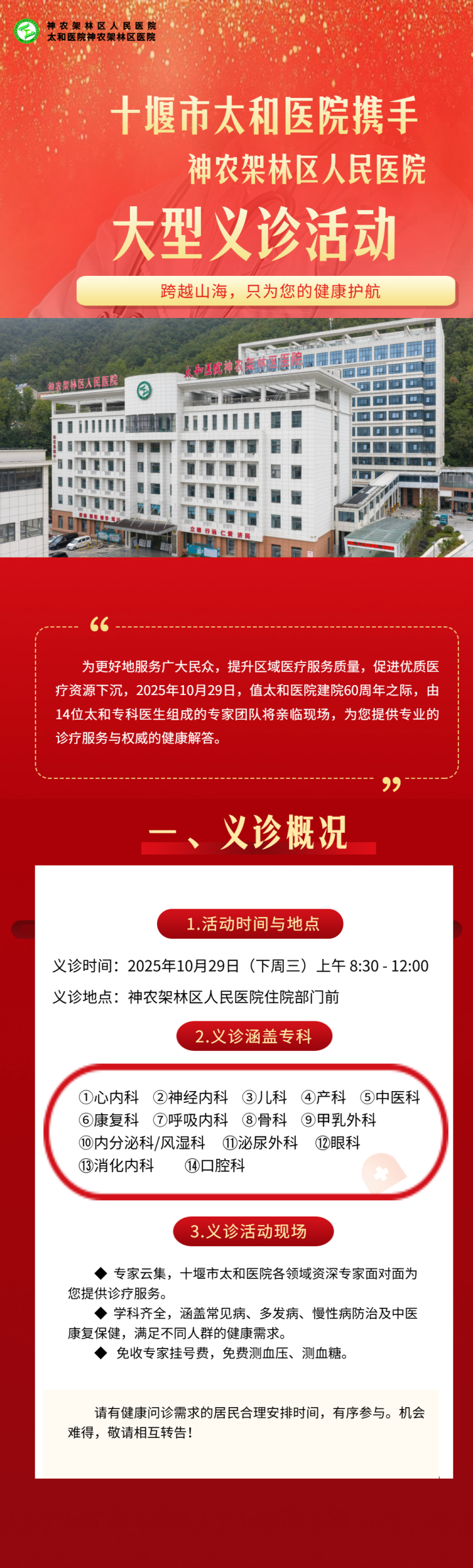 义诊活动来啦!十堰市太和医院专家团队即将来林区人民医院举办大型义诊活动,快来让专家们为您的健康把关吧!