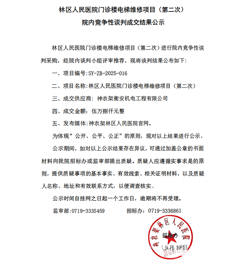 林区人民医院门诊楼电梯维修项目(第二次) 院内竞争性谈判成交结果公示