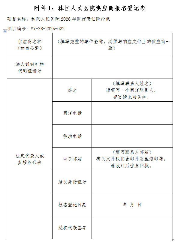 (1)必须如实填写《林区人民医院供应商报名登记表》(附件),纸质版(加盖公司公章随报名资料一起)和电子版(发送到我院招标办邮箱)各一份。