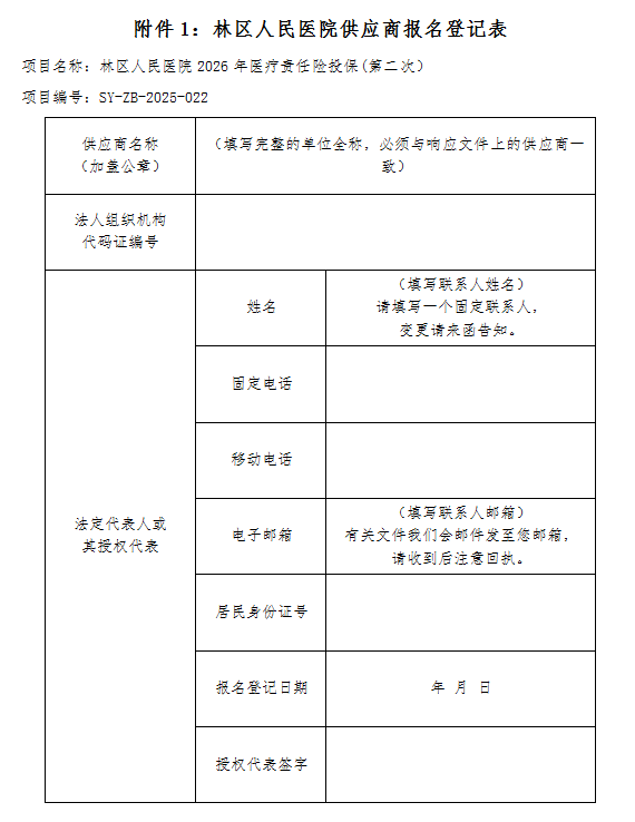 (1)必须如实填写《林区人民医院供应商报名登记表》(附件),纸质版(加盖公司公章随报名资料一起)和电子版(发送到我院招标办邮箱)各一份。