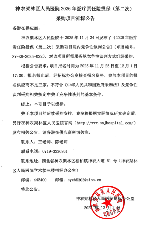 神农架林区人民医院2026年医疗责任险投保项目第三次(院内竞争性谈判文件)公告