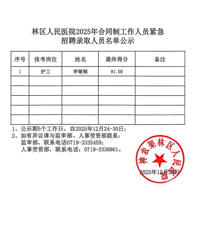 林区人民医院2025年合同制工作人员紧急招聘录取人员名单公示