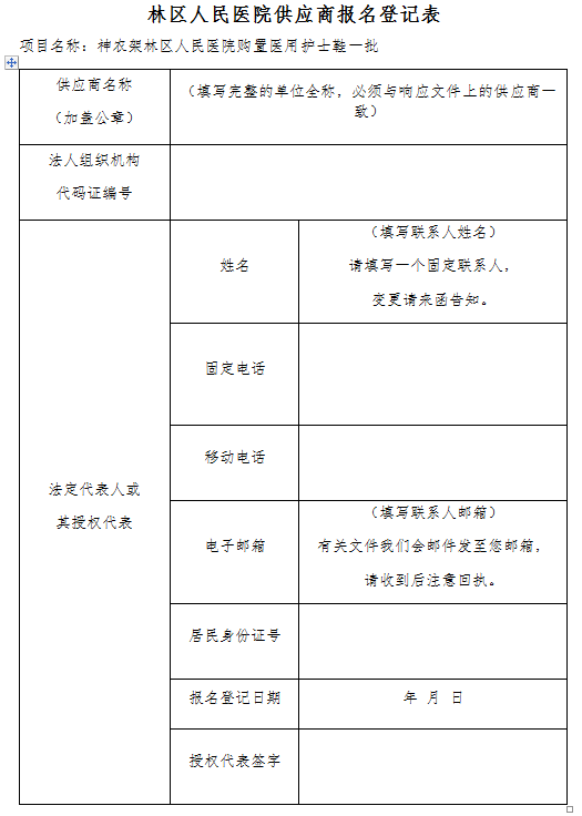 (1)必须如实填写《林区人民医院供应商报名登记表》(附件),纸质版(加盖公司公章随报名资料一起)和电子版(发送到我院护理部邮箱)各一份。