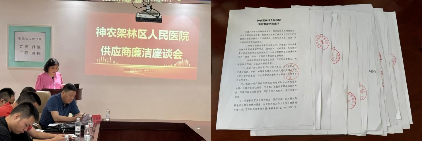 会议从观看警示教育片《戒·尺》开始,用近年来发生在林区身边的典型腐败案例,教育警示干部职工及供应商代表守住廉洁购销底线;监审部主任周慧宣读了《神农架林区人民医院供应商廉洁承诺书》,供应商现场签订廉洁承诺书。供应商代表及医院重点岗位部门负责人作出郑重承诺和表态发言。