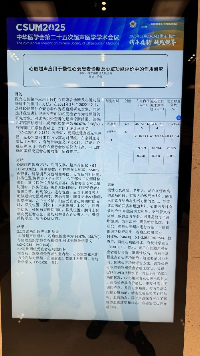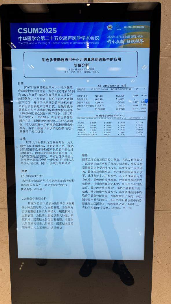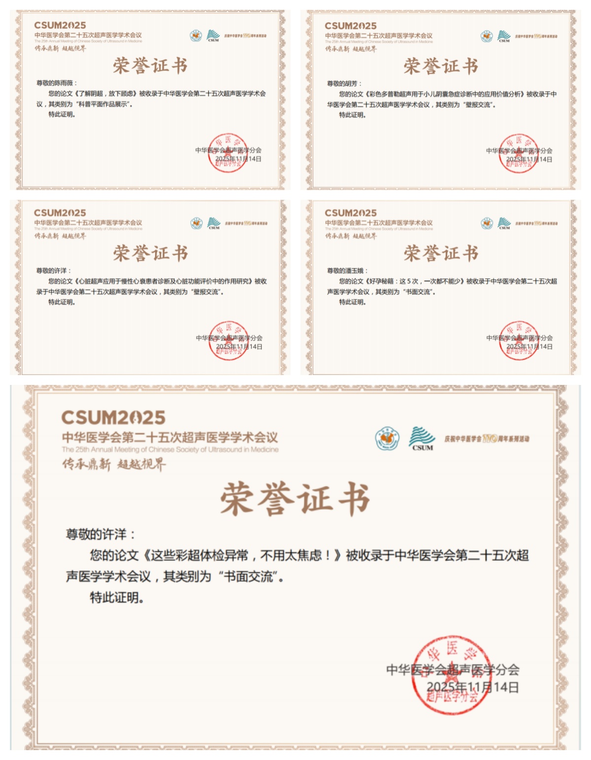 此次中稿论文涵盖多个领域,内容丰富实用。其中,科普作品《了解阴超,放下顾虑》被评为科普平面作品,在会议专属环节进行展示,致力于帮助女性消除检查顾虑。此外,儿科超声领域的《彩色多普勒超声用于小儿阴囊急症诊断中的应用价值分析》与心肌病变领域的《心脏超声应用于慢性心衰患者诊断及心脏功能评价中的作用研究》两篇论文均被评为壁报交流,于会场现场展示。
