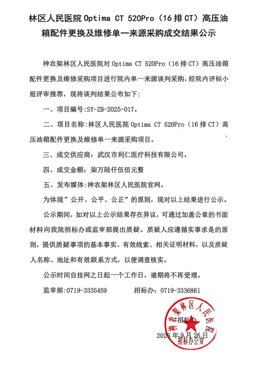 林区人民医院Optima CT 520Pro (16排CT)高压邮箱配件更换及维修单一来源采购成交结果公示