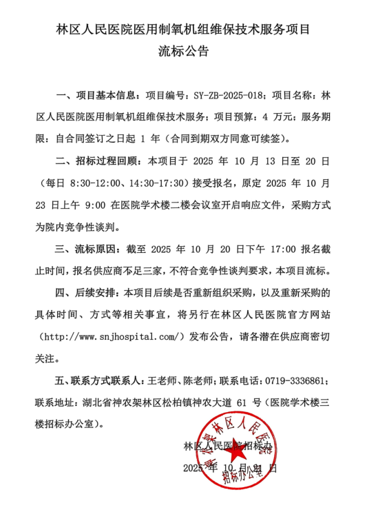 林区人民医院医用制氧机组维保技术服务项目流标公告