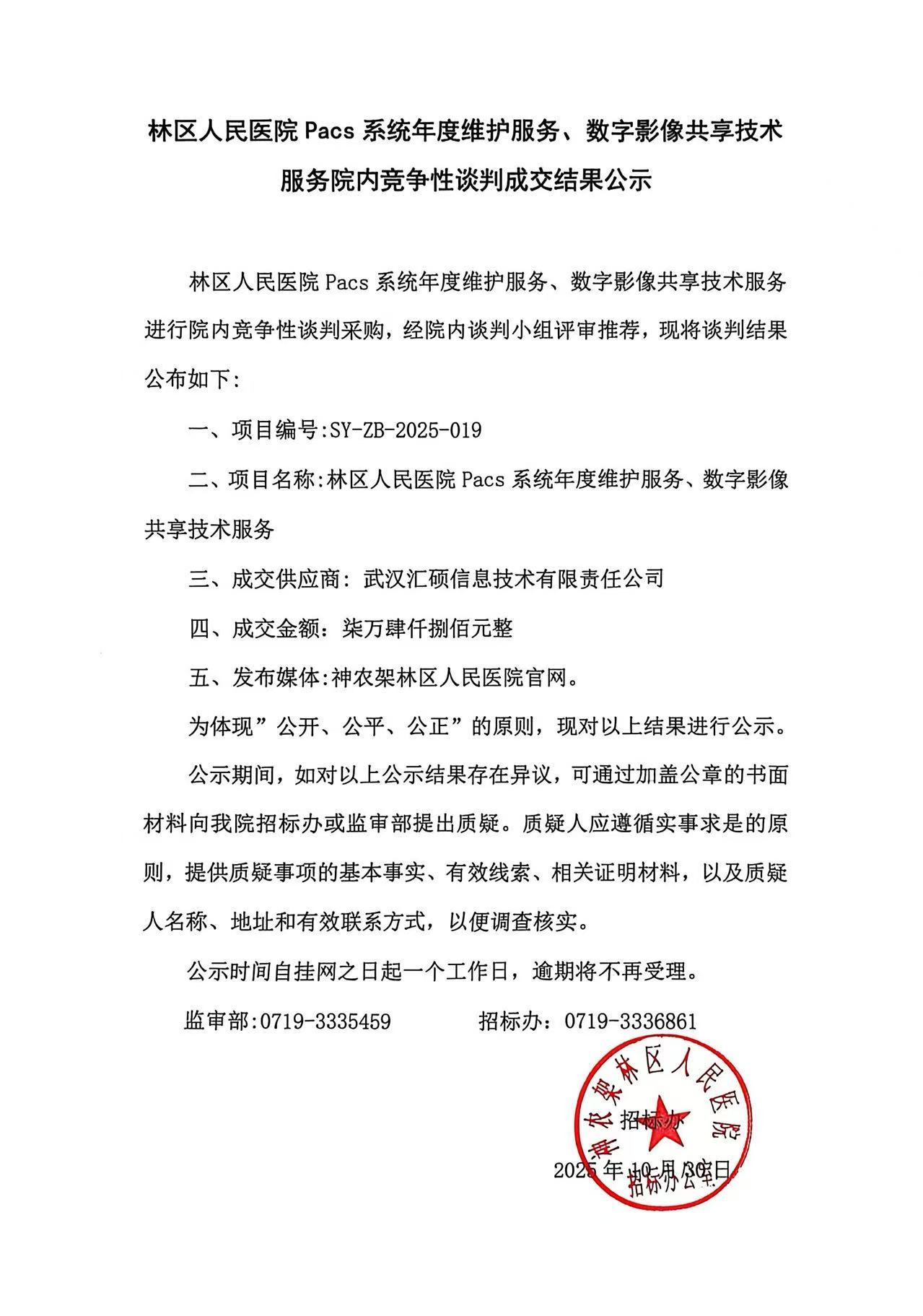 林区人民医院Pacs系统年度维护服务、数字影像共享技术服务院内竞争性谈判成交结果公示
