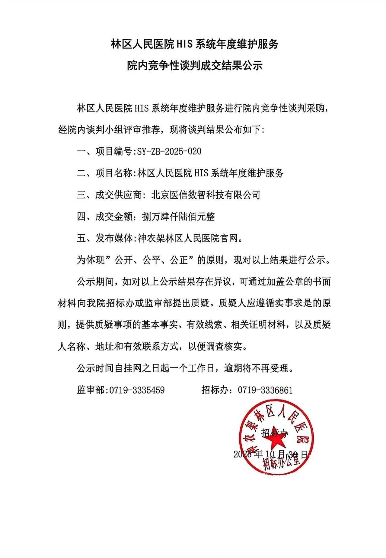 林区人民医院HIS系统年度维护服务院内竞争性谈判成交结果公示
