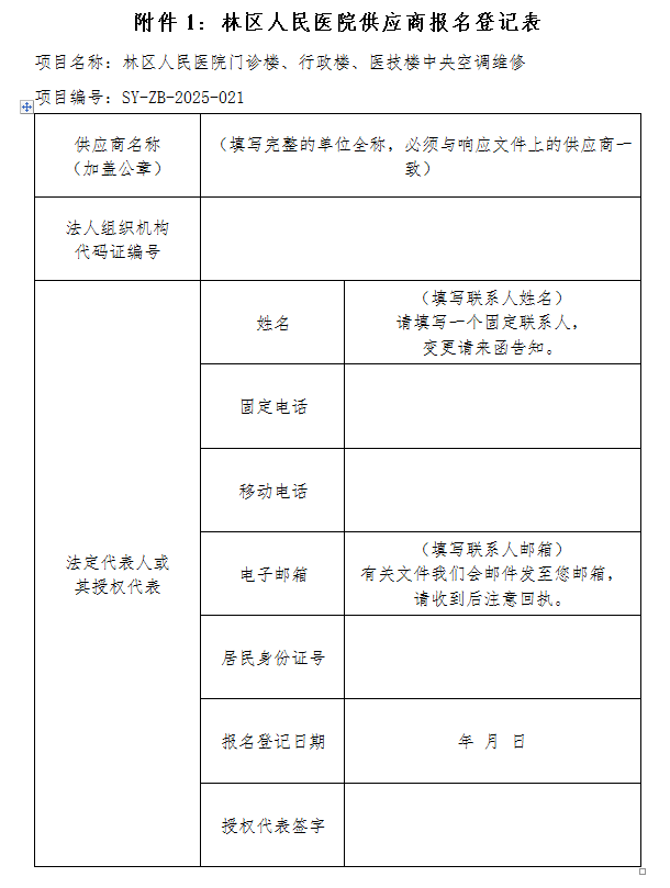 (1)必须如实填写《林区人民医院供应商报名登记表》(附件),纸质版(加盖公司公章随报名资料一起)和电子版(发送到我院招标办邮箱)各一份。