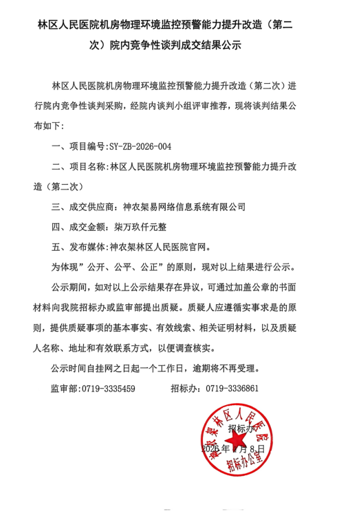 林区人民医院机房物理环境监控预警能力提升改造(第二次)院内竞争性谈判成交结果公示