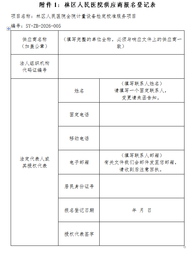 (1)必须如实填写《林区人民医院供应商报名登记表》(附件),纸质版(加盖公司公章随报名资料一起)和电子版(发送到我院招标办邮箱)各一份。