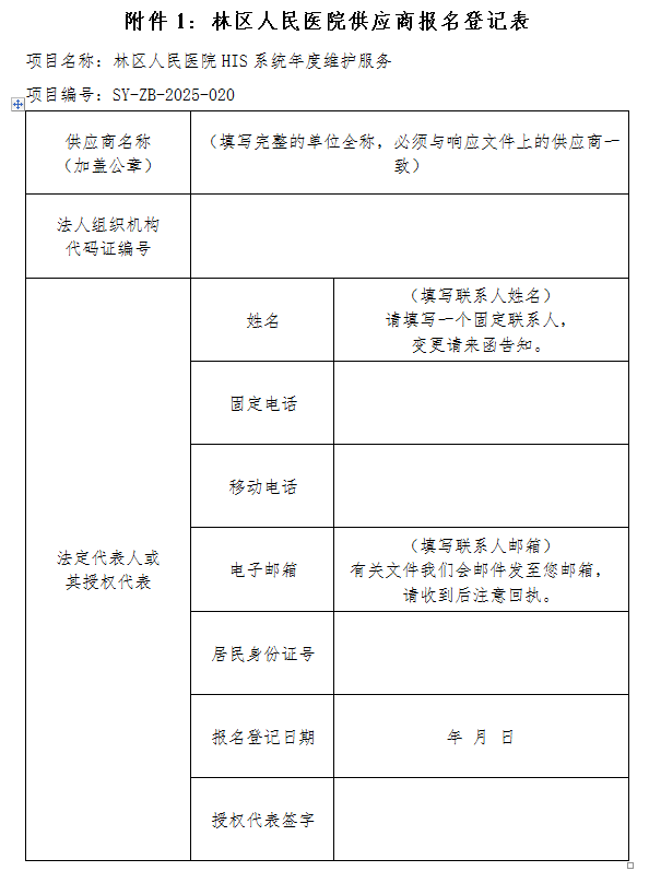 (1)必须如实填写《林区人民医院供应商报名登记表》(附件),纸质版(加盖公司公章随报名资料一起)和电子版(发送到我院招标办邮箱)各一份。