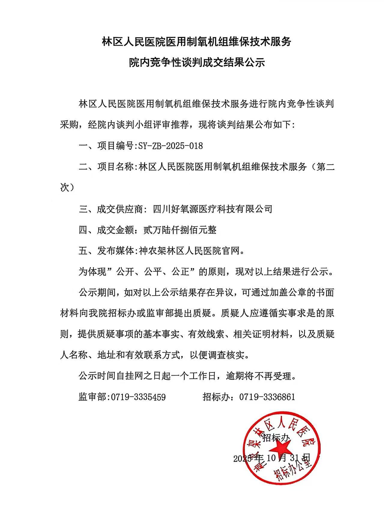 林区人民医院医用制氧机组维保技术服务院内竞争性谈判成交结果公示